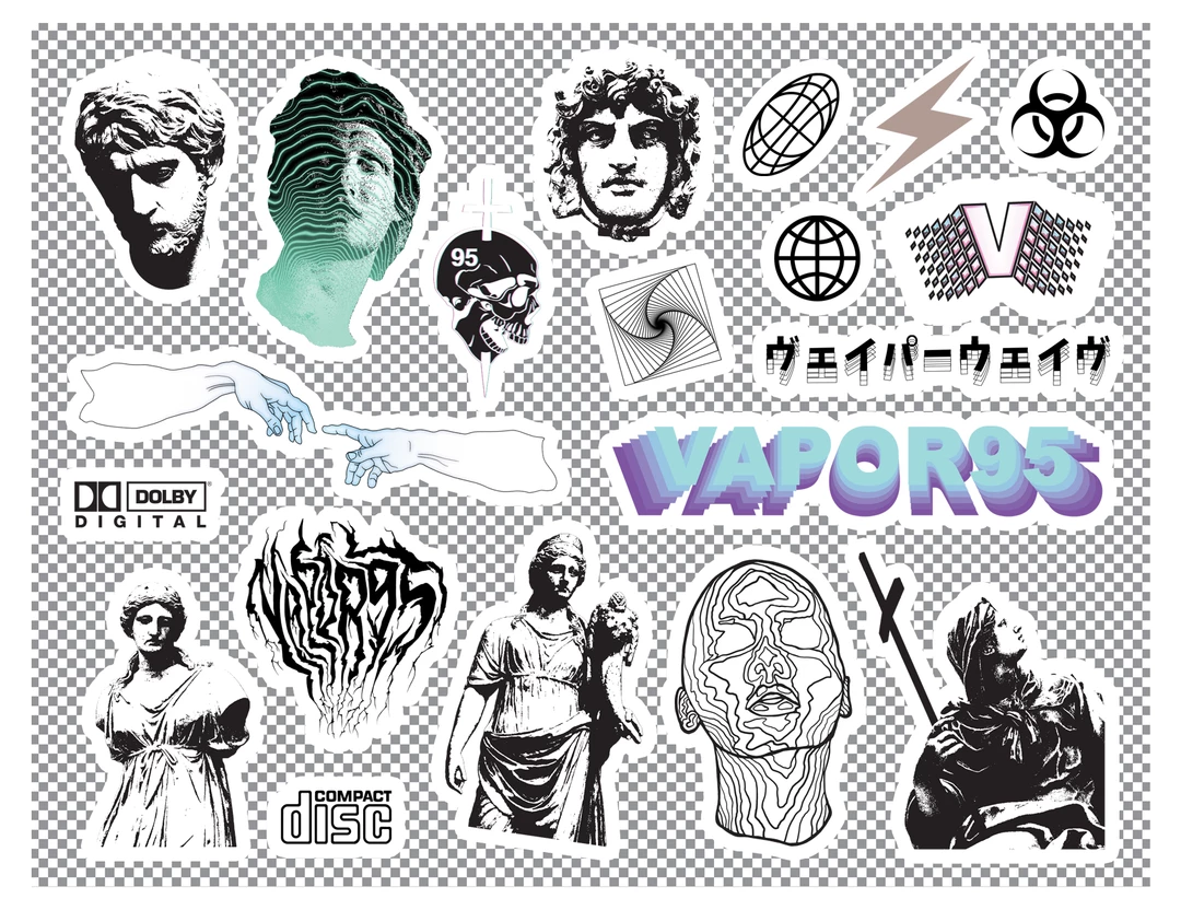 - FEATURING 20 VINYL VAPORWAVE STICKERS FOR YOUR AESTHETIC DECORATING ENDEAVORS ON ONE SHEET.